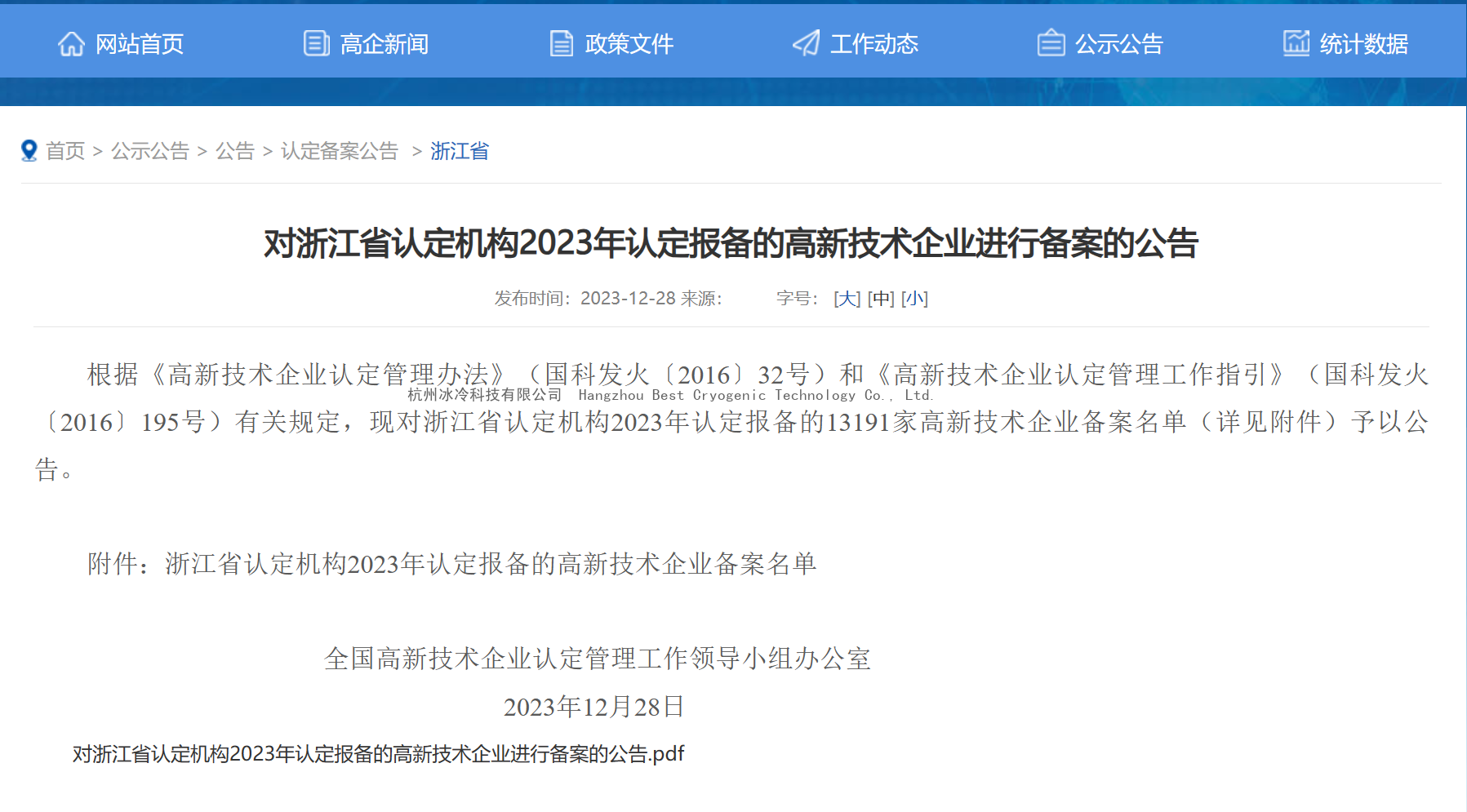 On December 28, 2023, the Office of the Leading Group of the National high-tech Enterprise Accreditation Management issued the 2023 National high-tech enterprise certification list in Zhejiang Province, Hangzhou Best Cryogenic Technology Co., Ltd. was successfully selected by virtue of its excellent research and development strength and innovation ability, marking that ice technology companies have been affirmed and recognized by relevant state departments in research and development and innovation. Thus officially entered the ranks of national high-tech enterprises.